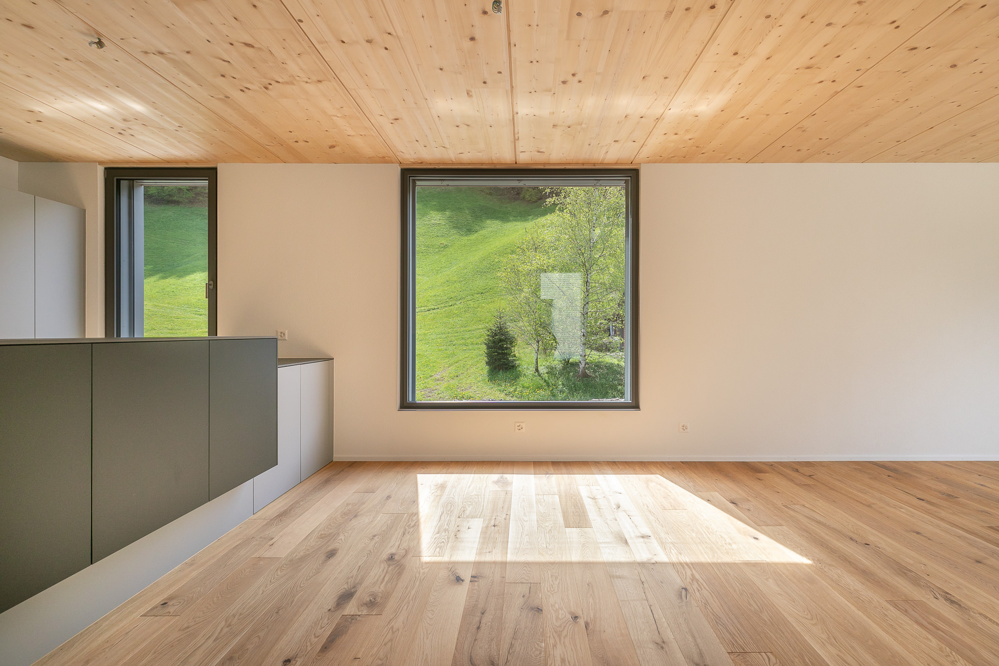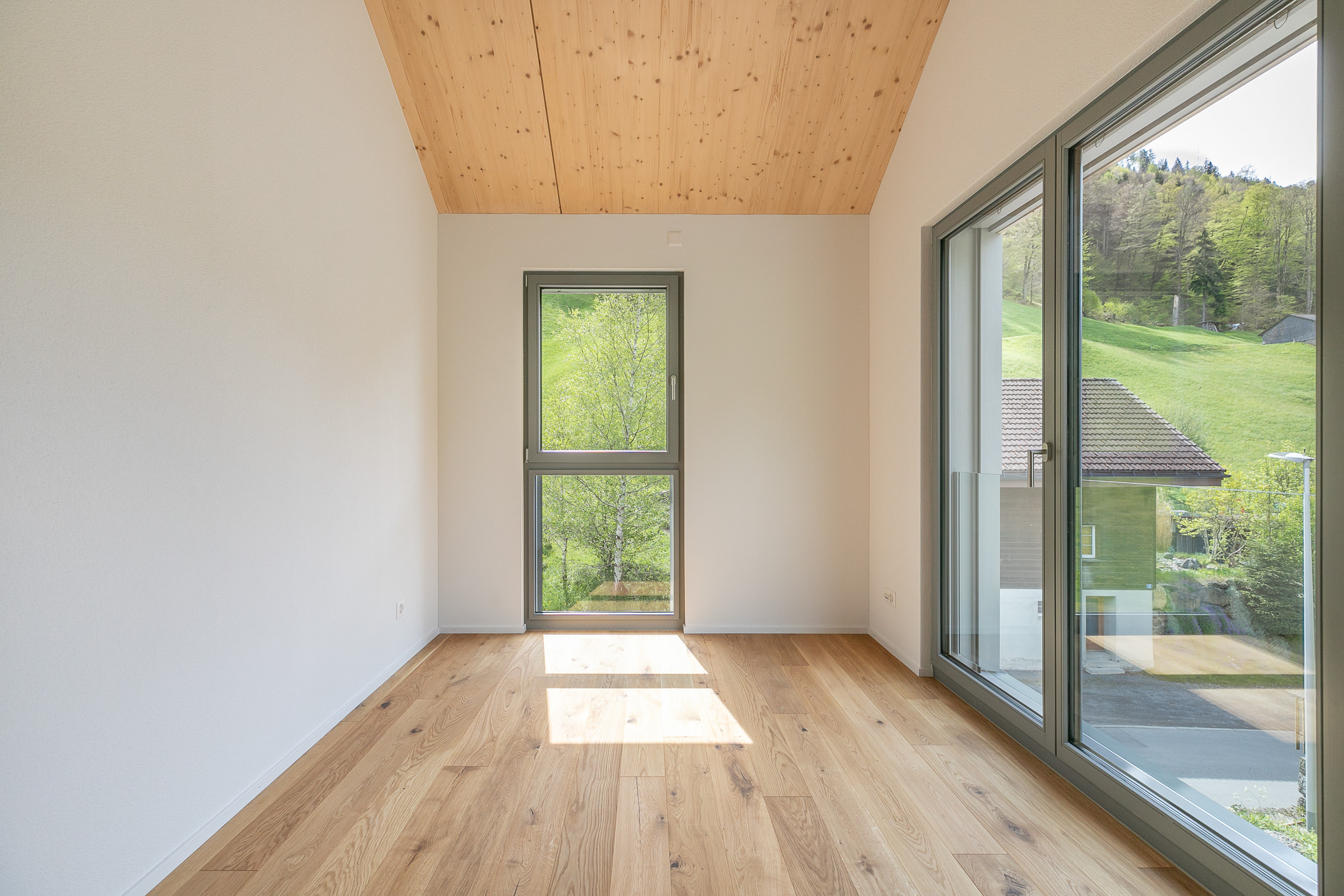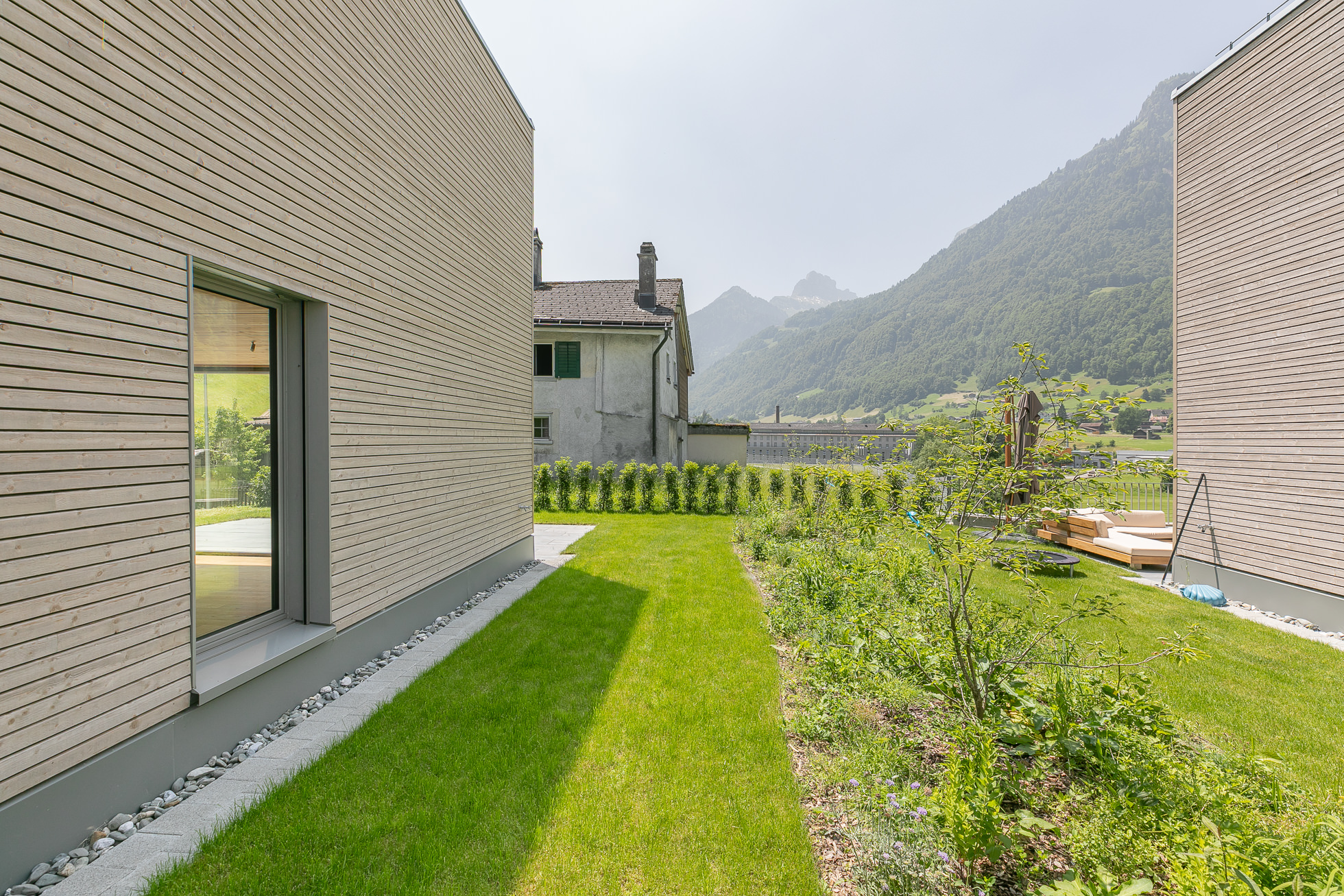 Das Haus Ost überzeugt mit geschütztem Sitzplatz und Blick zum Leuggelenstock. Die gemeinsame Gartenflächen mit Geräteraum sowie eine Landwirtschaftsfläche bieten Gestaltungsfreiraum für die neuen Bewohner. Das Haus West ist bereits reserviert.