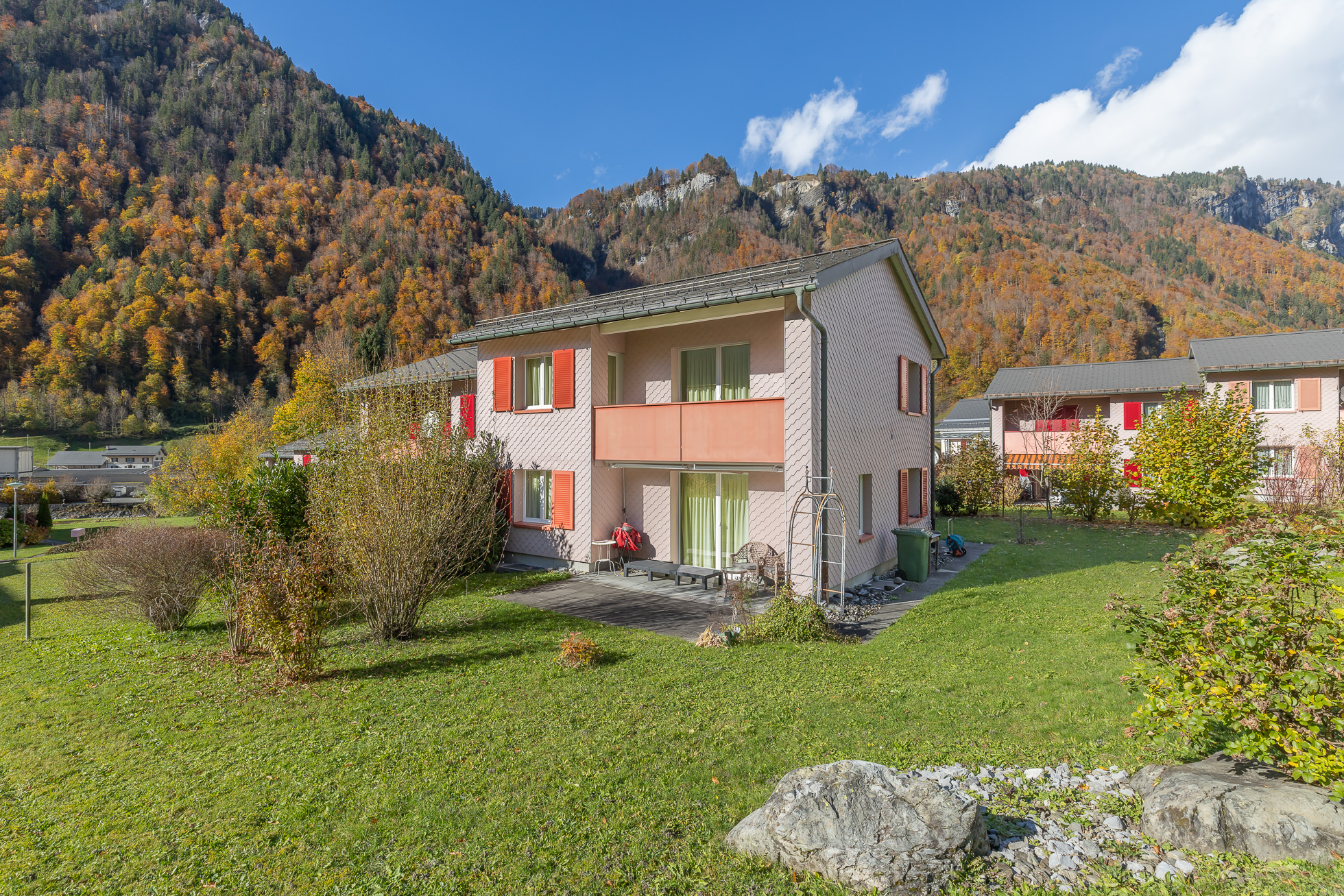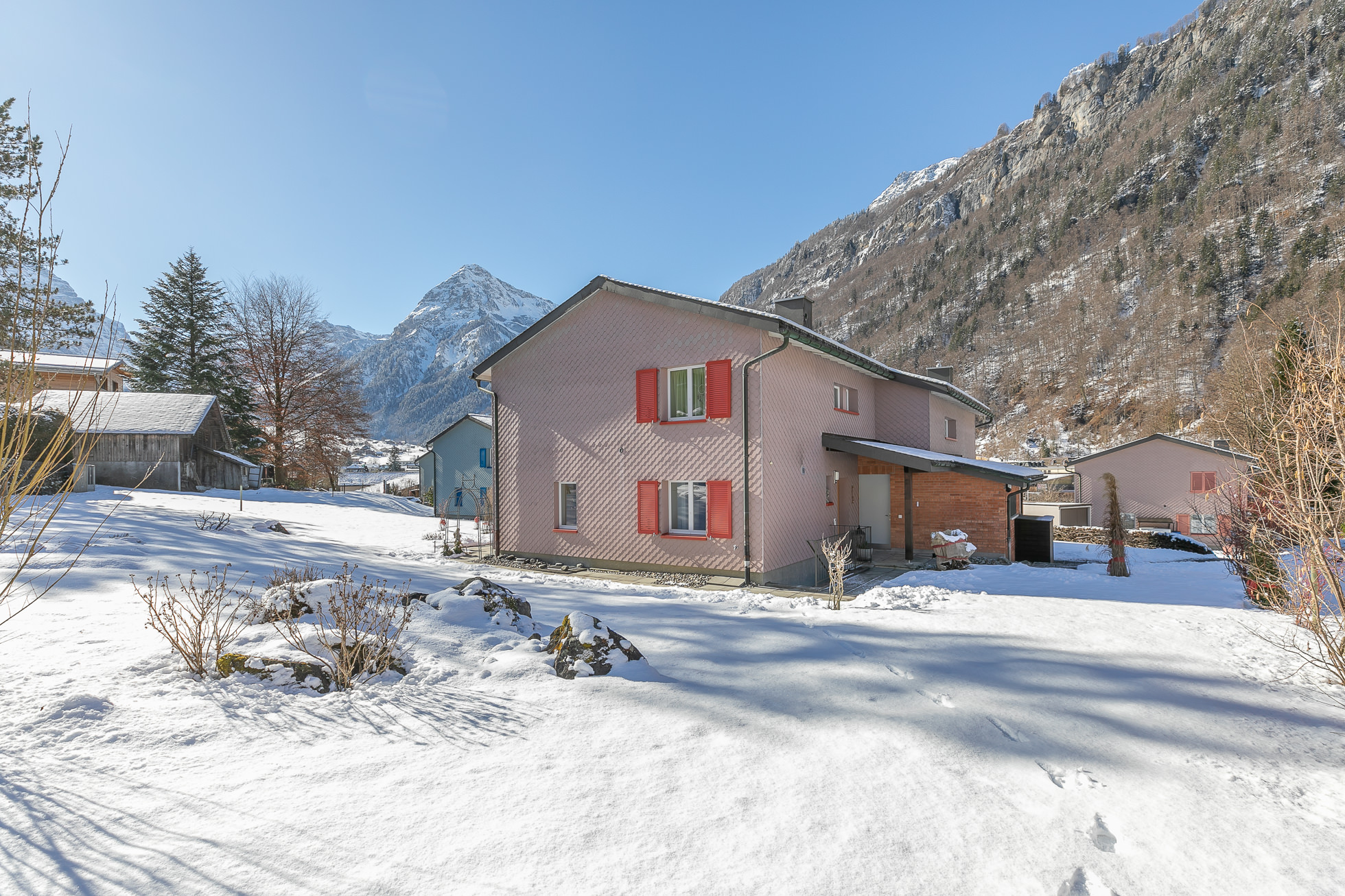 Das Doppeleinfamilienhaus befindet sich an ruhiger Lage in einem familienfreundlichen Wohnquartier. Einkaufsmöglichkeiten, Restaurants, Schulen und Bahnhof sind innert wenigen Gehminuten erreichbar. Der Klausenpass, das Ski- und Erholungsgebiet Braunwald sowie Spazier- und Wanderwege befinden sich in unmittelbarer Umgebung. Glarus ist innert 20 Minuten und der Autobahnanschluss A3 innert 30 Minuten erreichbar. Mit der S25 gelangen Sie ab Linthal bequem ohne Umsteigen an den Zürich HB.